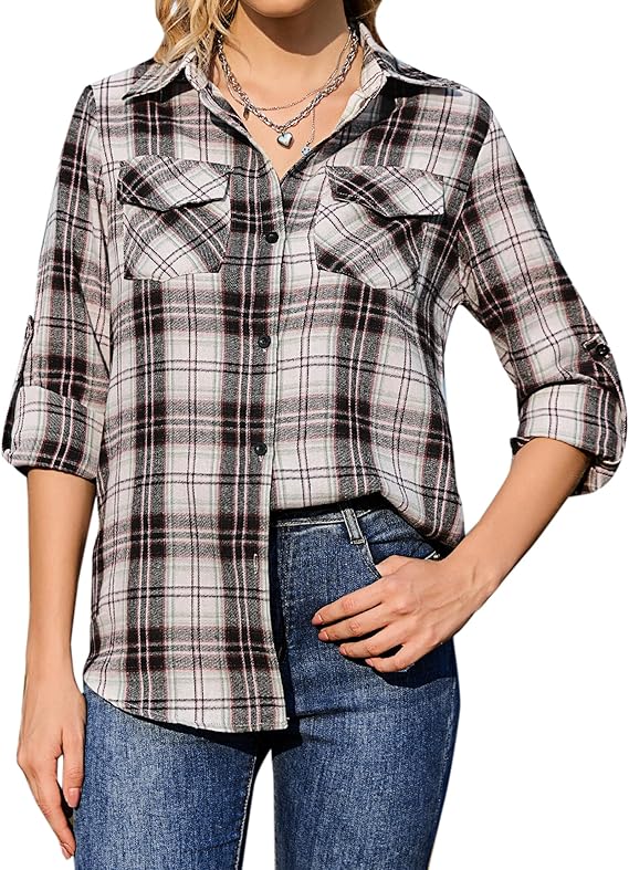 • Feature: button-down shirt, turn-down collar, roll-up long sleeve, button closure, plaid pattern, simple, removable, two chest pockets, casual loose fit, boyfriend style – great addition to any wardrobe